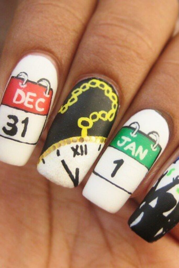 Featuring “Dec 31” and “Jan 1” calendar nails, along with a clock and party symbols, this playful style tells a story at your fingertips.