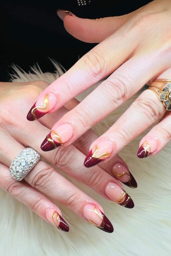 Start by applying a nude base coat and then adorn the tips with a deep burgundy polish. Use a thin brush to add intricate gold swirls, adding a touch of sparkle and sophistication.