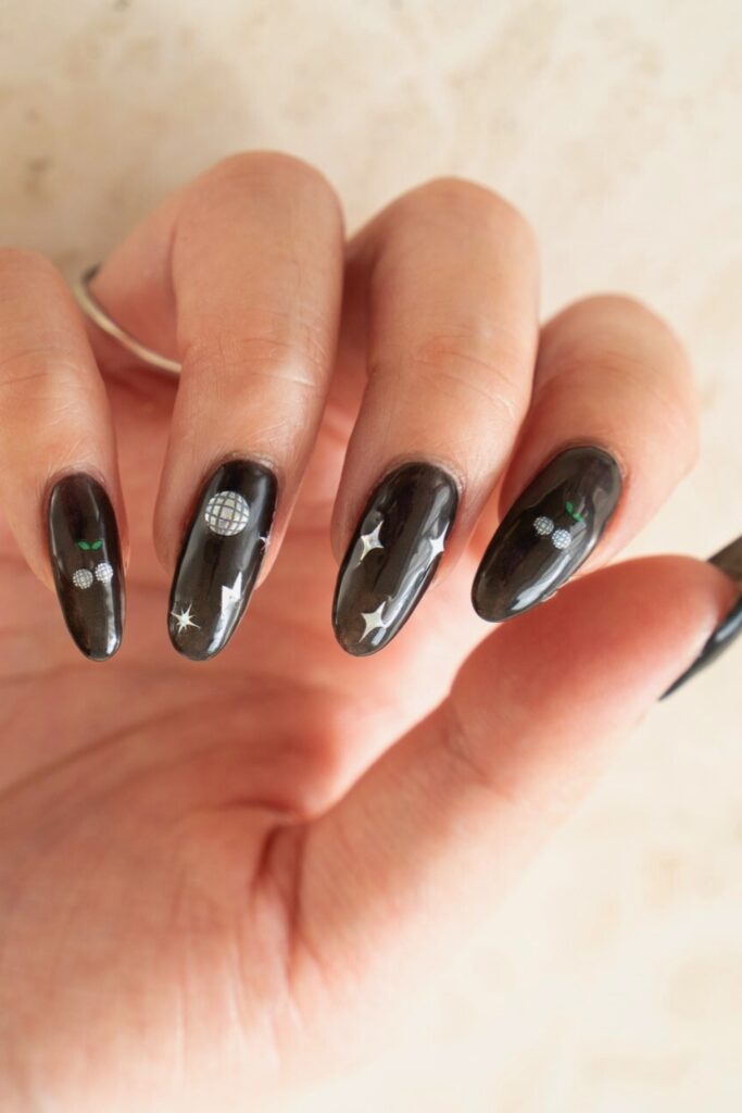 Transform your nails into a festive party with the Disco Ball Night Sky design. This look embodies a New Year’s Eve celebration, featuring mini disco balls and silver stars that sparkle against a glossy black base.