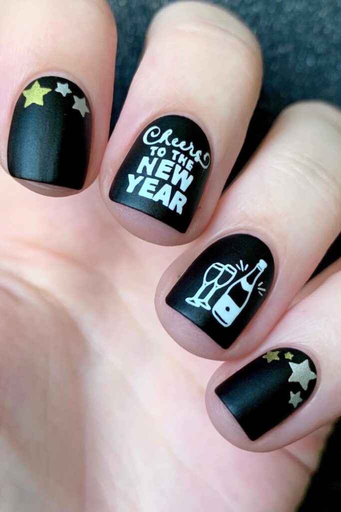 Begin with a matte black polish to set a chic background. Use nail art stamps or a fine brush to paint champagne glasses, stars, and a “Cheers to the New Year” text in white and gold.