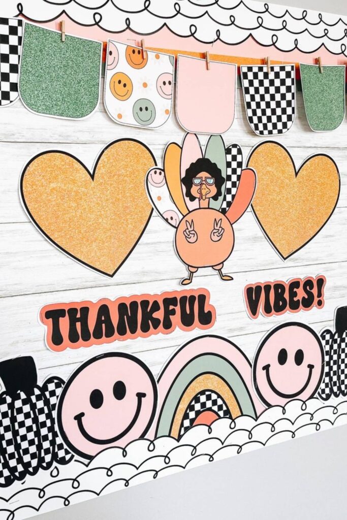 Bring some fun to gratitude with the Thankful Vibes Bulletin Board. This design uses a playful retro style with smiley faces, peace signs, and a cheeky cartoon turkey.