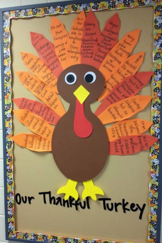 Celebrate Thanksgiving with the Thankful Turkey bulletin board, a festive way to showcase gratitude. Picture a large turkey adorned with vibrant paper feathers in shades of orange, red, and yellow.