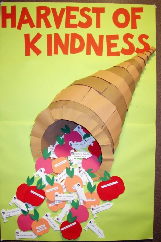 Embody the spirit of giving with the Harvest of Kindness bulletin board. Imagine a 3D cornucopia overflowing with paper apples and pumpkins, each inscribed with messages of kindness or good deeds contributed by students.