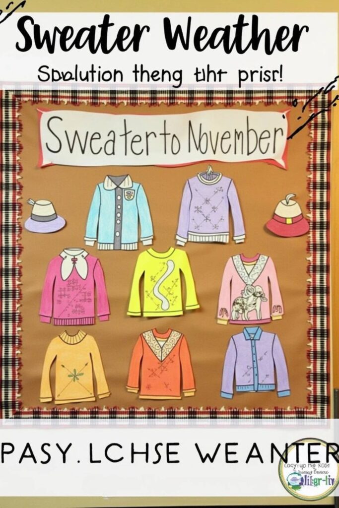 The Cozy Season Sweater Display is all about celebrating warmth and comfort. It showcases illustrated sweaters with charming labels like “Cozy Warm Blankets” and “Cozy Hot Chocolate” to reflect November themes.