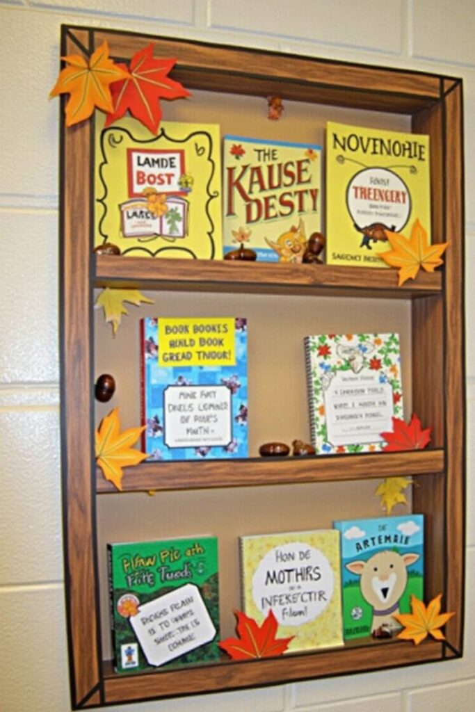 Transform your bulletin board into a November Book Shelf, a seasonal showcase of favorite or recommended books. Picture a shelf filled with book covers or titles, surrounded by fall-themed decor like leaves and acorns.