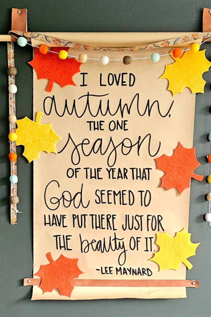 The Autumn Inspiration Quote Board is a delightful way to embrace the beauty of fall. Using brown paper rolled like a scroll, this board features an uplifting quote about the wonders of autumn.