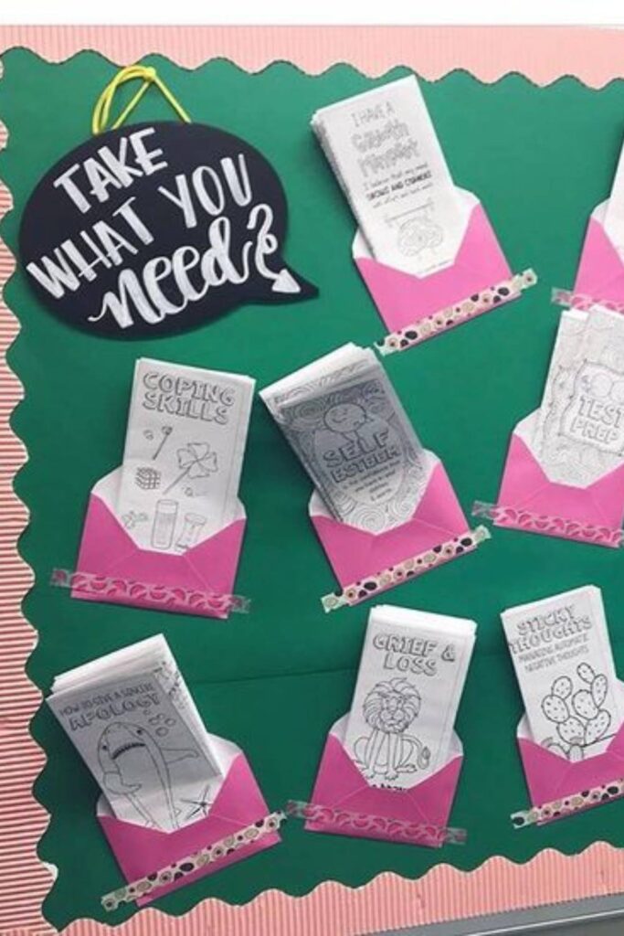 The Take What You Need Encouragement Board is a source of positivity and support. It features small envelopes labeled with topics such as “Coping Skills,” “Positive Thoughts,” and “Stress Relief,” each containing mini pamphlets for students to take.