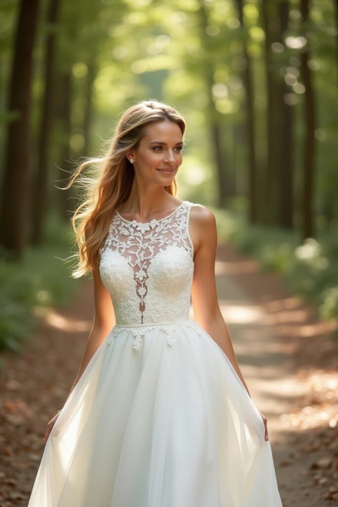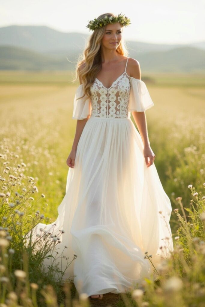 This dress is ideal for outdoor ceremonies, whether in a garden, meadow, or beach setting.