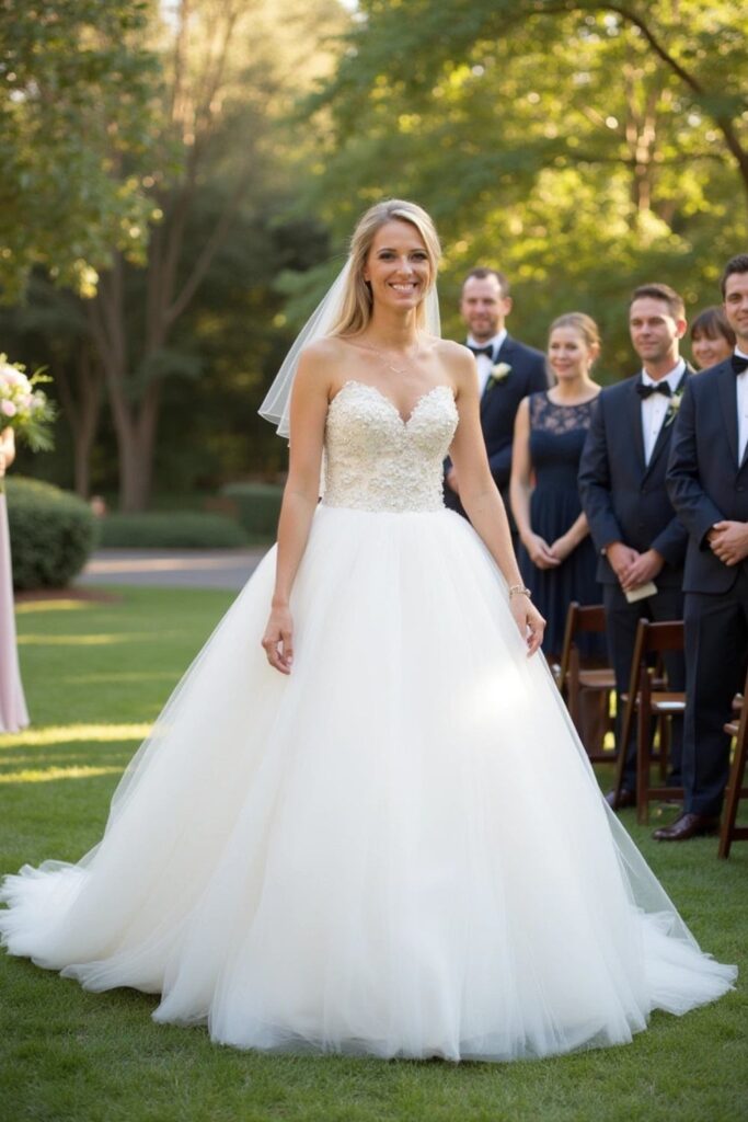 The lightweight tulle skirt brings movement and adds whimsy, making it ideal for outdoor ceremonies.