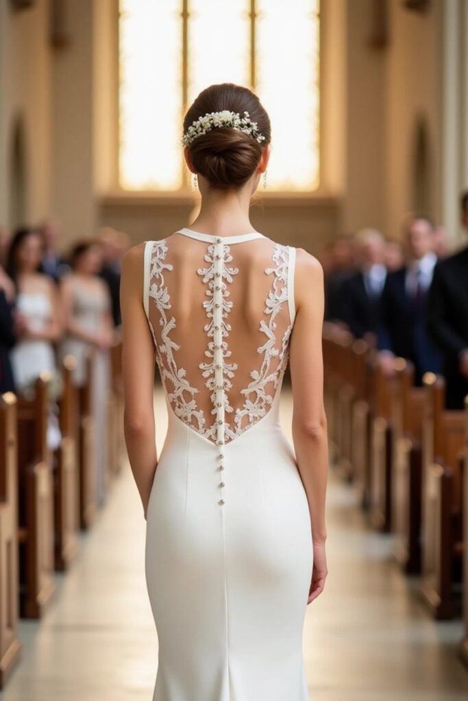 Its fitted silhouette gracefully accentuates the figure, while the simplicity of the gown ensures the back remains the focal point.