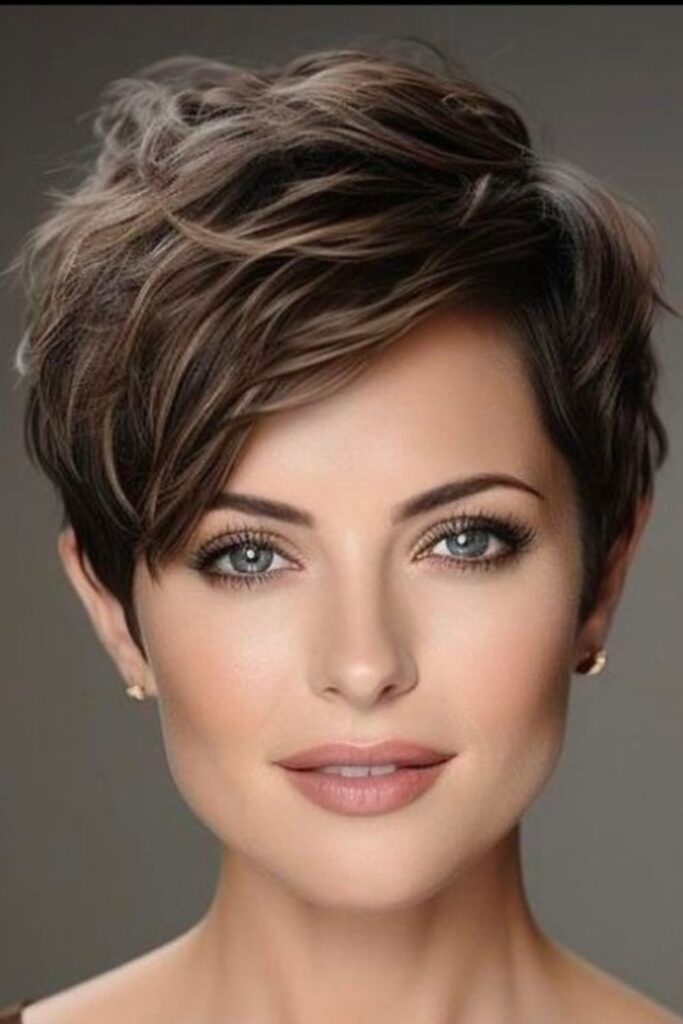 The textured pixie cut with a side-swept bang adds a playful twist to a classic look. This style features layers that create dimension and movement, giving the hair a fuller appearance.