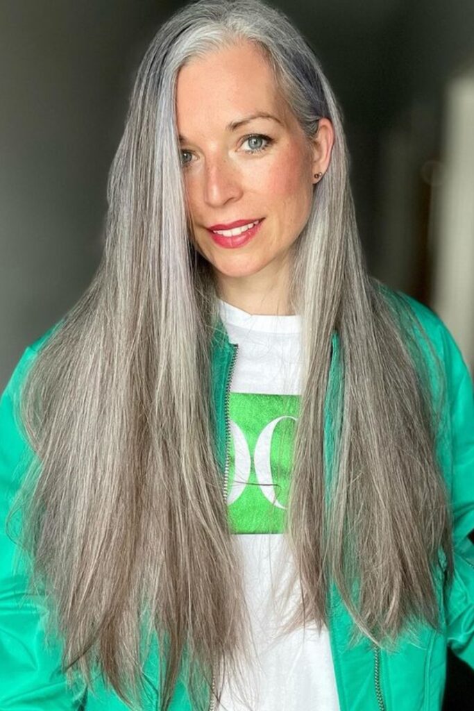 This long silver hairstyle is perfect for women who cherish their natural gray hair while maintaining length. The sleek, straight style highlights the hair’s smooth texture, displaying its health and shine.