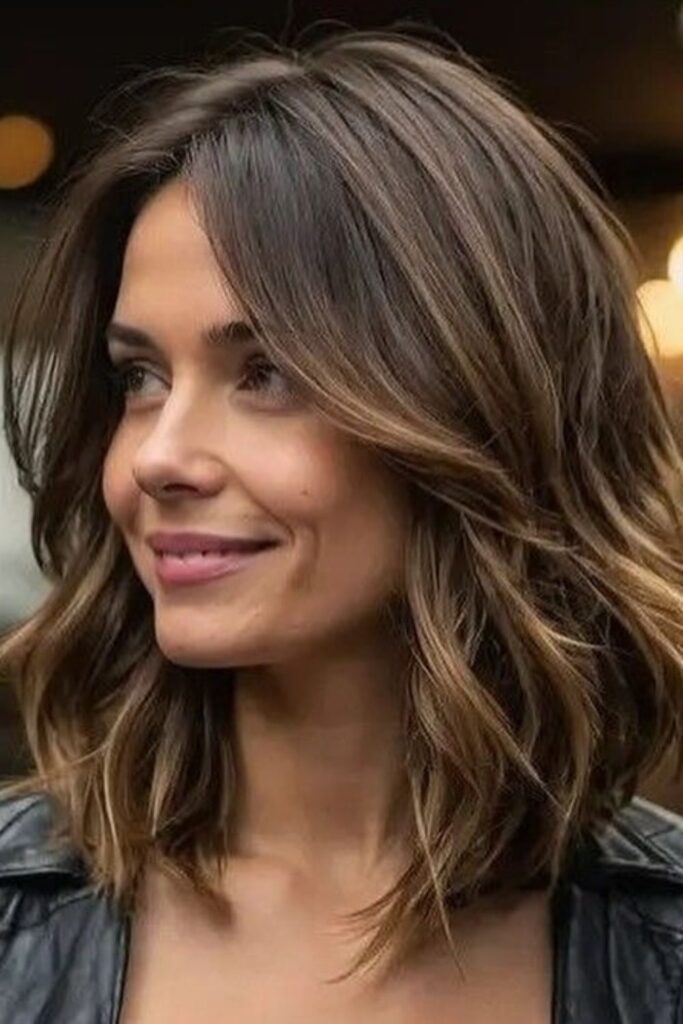 This hairstyle is perfect for those who prefer medium-length hair, offering a modern twist with subtle waves that add both volume and dimension.