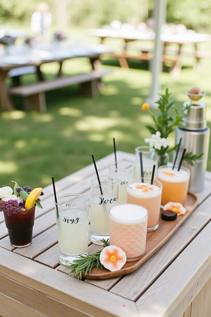 Offer an array of personalized cocktails, complete with signature drinks named after the couple. Incorporate elegant glassware, a stylish bar setup, and fresh garnishes for added flair.
