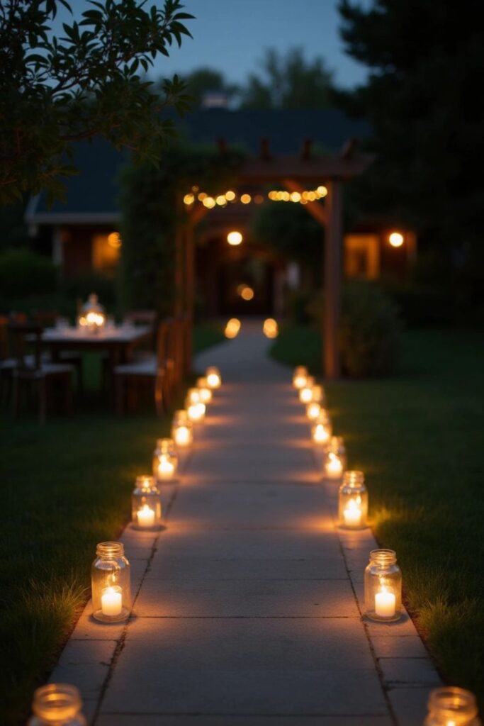 Place candles inside glass jars or lanterns to line walkways, creating a soft, magical glow for an unforgettable evening ambiance.