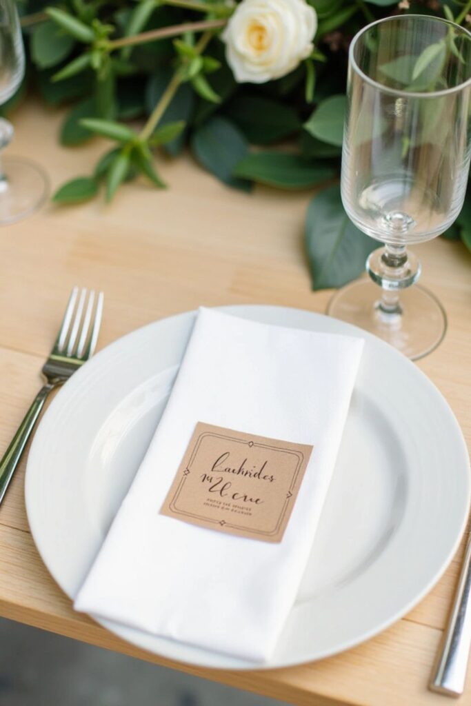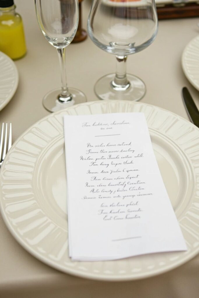 Bring a personal touch to the tablescape with elegantly handwritten menus. Use fine calligraphy on high-quality paper or rustic wooden boards for a unique twist.