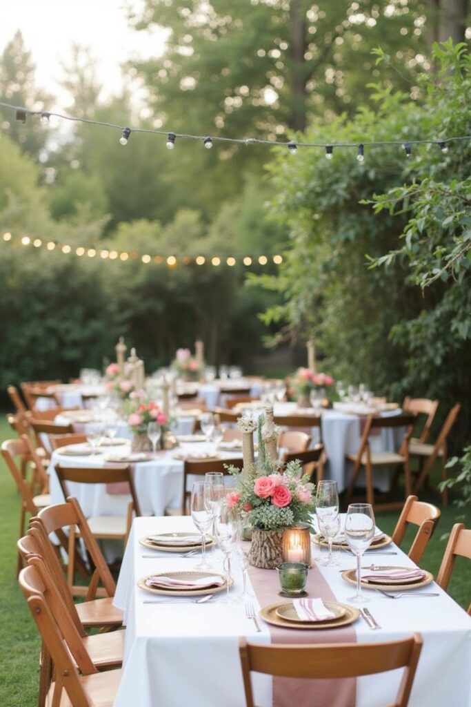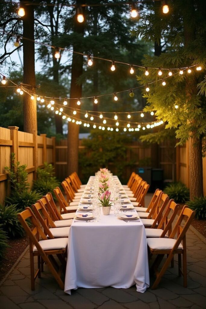 Use twinkling or warm-toned bulbs for that dreamy effect and make sure to hang them strategically to highlight key areas like the dining or dancing spots.