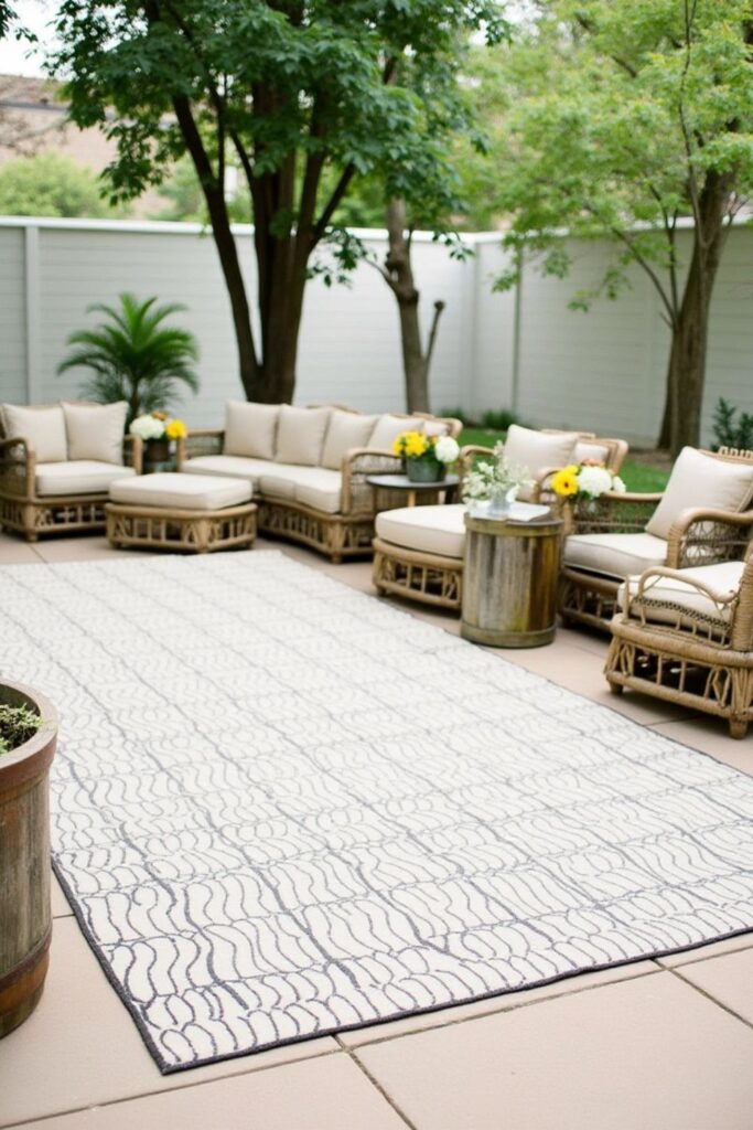Use stylish outdoor rugs to create defined, intimate zones for dining, dancing, or lounging. Bold patterns, soft tones, and layered textures bring a sense of comfort and elegance.
