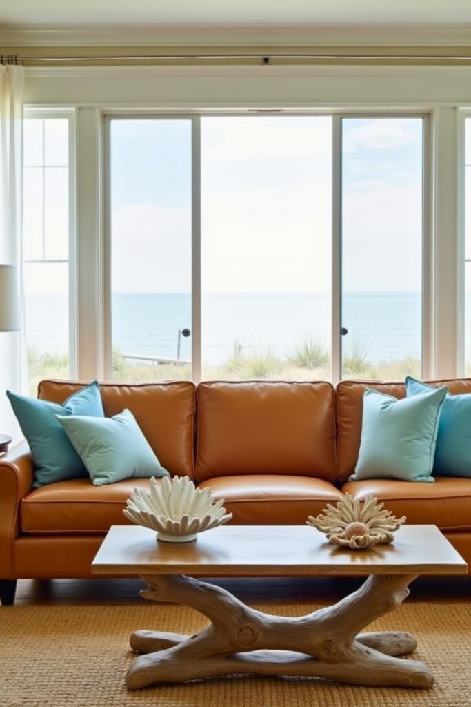 This design elegantly combines the warmth of your tan leather couch with fresh coastal hues, creating a serene and breezy atmosphere that invites relaxation.