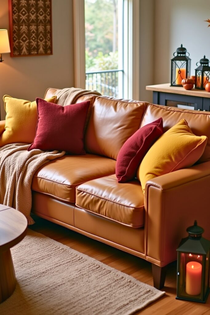 Infuse your living room with the rich, inviting tones of autumn. Use warm colors like burnt orange, burgundy, and mustard yellow in pillows, throws, or curtains to complement your tan couch beautifully.