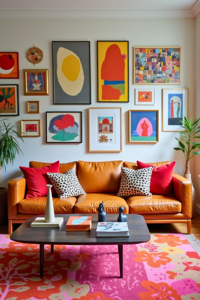 Unleash your creativity with an art-filled living room that stimulates the senses. Surround your tan leather couch with bold, artistic elements like a gallery wall featuring colorful art prints or paintings.