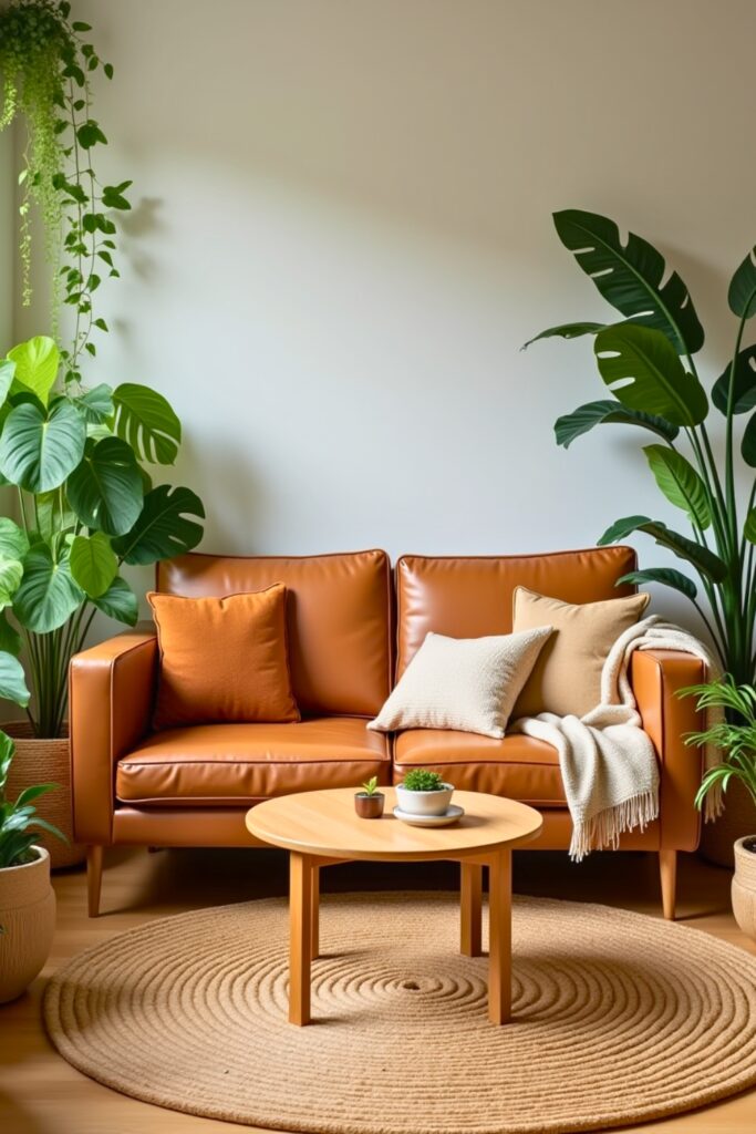 Transform your living room into a natural oasis by surrounding your tan leather couch with a variety of indoor plants like monstera, snake plants, and pothos.