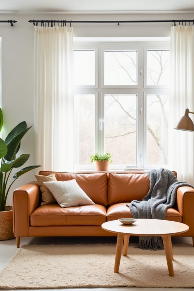 Achieve Scandinavian elegance by placing a tan leather couch in a bright room with white or pale gray walls.