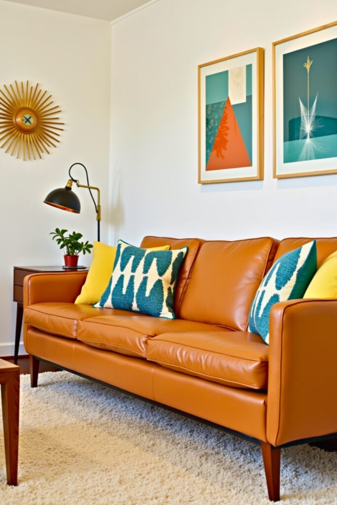 Add contrast with geometric-patterned throw pillows in mustard yellow or teal. Consider adding a starburst clock or retro wall art for a bit of flair.