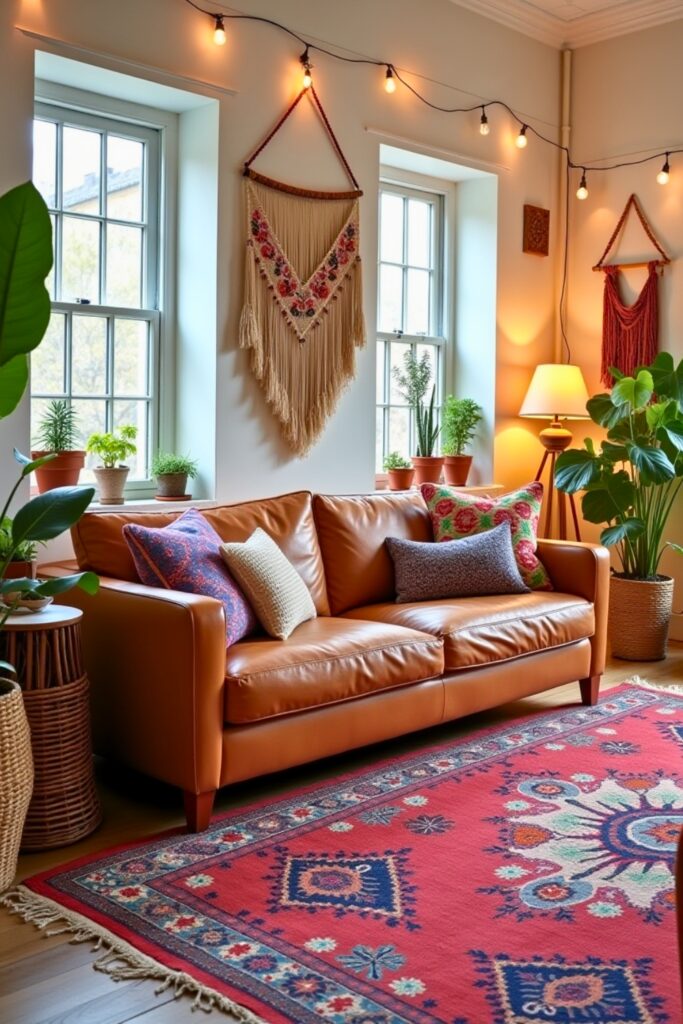 Turn your living room into a boho retreat with a tan leather couch as the centerpiece. Add layers of colorful, patterned throw pillows for a splash of vibrancy.