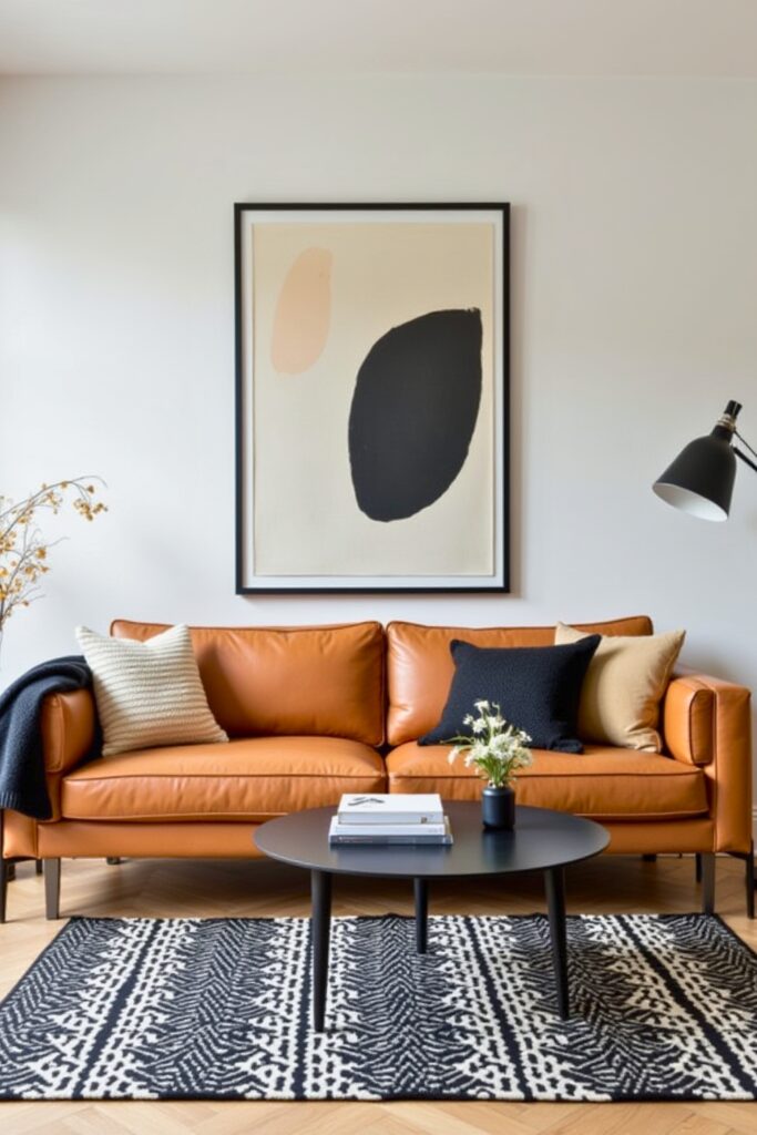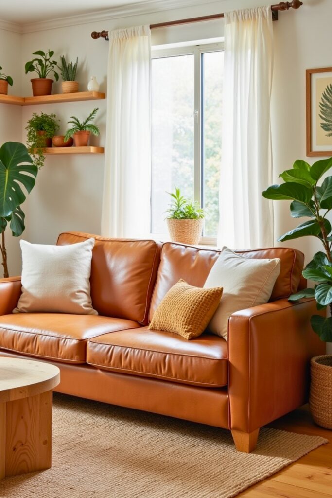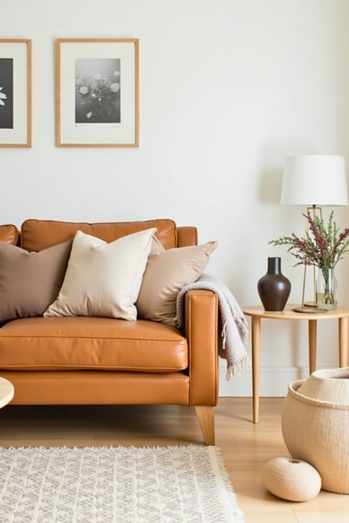 Transform your living room into a cozy retreat by combining a tan leather couch with earthy elements. Start with a reclaimed wooden coffee table and a jute rug for a rustic foundation.