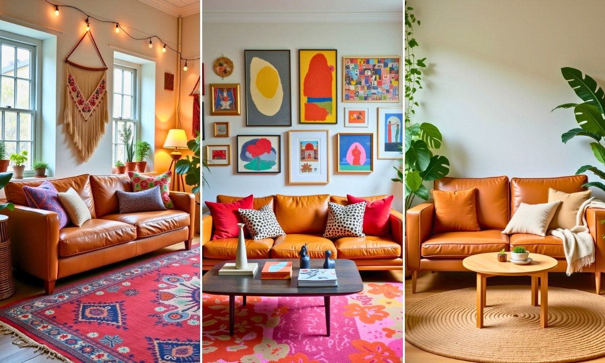 Transform your living room into a cozy retreat by combining a tan leather couch with earthy elements. Start with a reclaimed wooden coffee table and a jute rug for a rustic foundation.