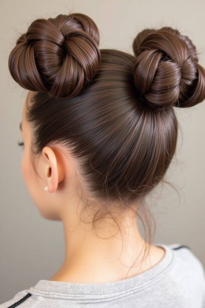 Achieve a timeless elegance with the Sleek and Simple Double Buns hairstyle, perfect for those who appreciate a polished, refined look. Start by neatly parting your hair down the middle and gently brushing each section until smooth and shiny.