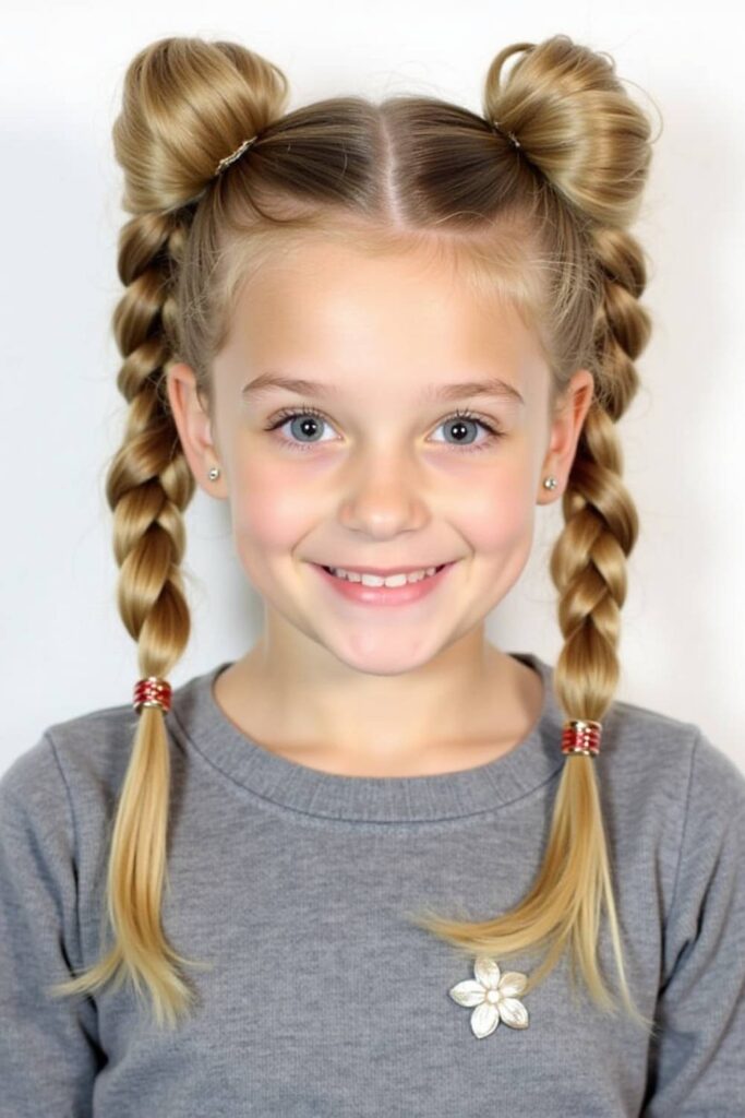 This charming hairstyle merges two puffs with side braids and colorful ribbon ties for a delightful effect. Start by parting your hair in the middle, then braid each side from the front to the nape.