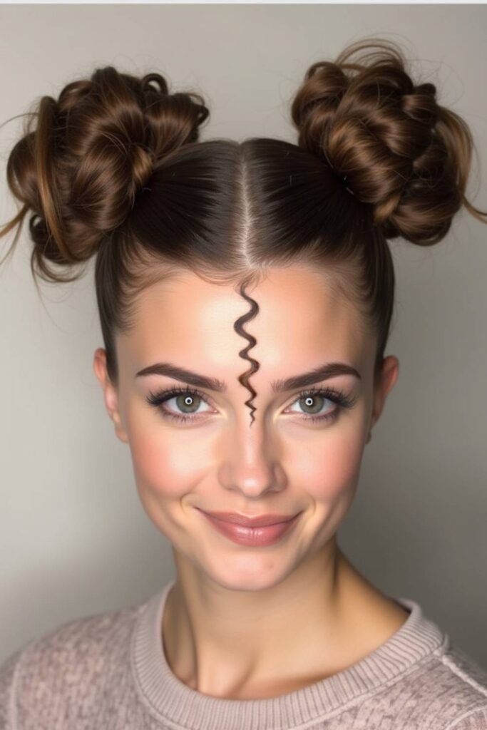 Begin by parting your hair down the middle, then gather each side into a bun. To spice it up, leave a small section of hair in the center, curl it, and let it softly frame your face.
