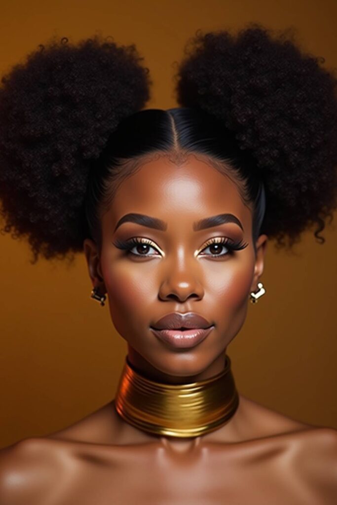 Channel your inner fashion icon with Sleek Afro Puffs adorned with striking accessories. Start by parting your hair neatly down the middle and gather each side into high puffs. Use a styling gel to smooth out the edges for a polished, sleek look.