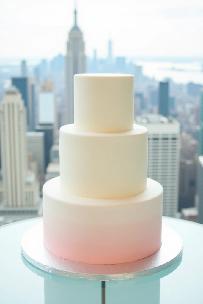 Vision a cake where tiers transition in a soft ombre gradient, flowing from blush pink to creamy white or pastel blue.