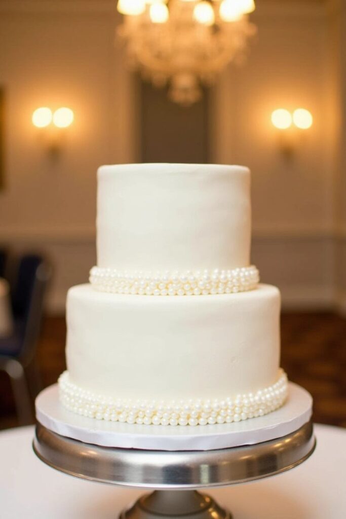 This luxurious two-tiered masterpiece boasts a flawless fondant surface dotted with edible pearls arranged in even precision.