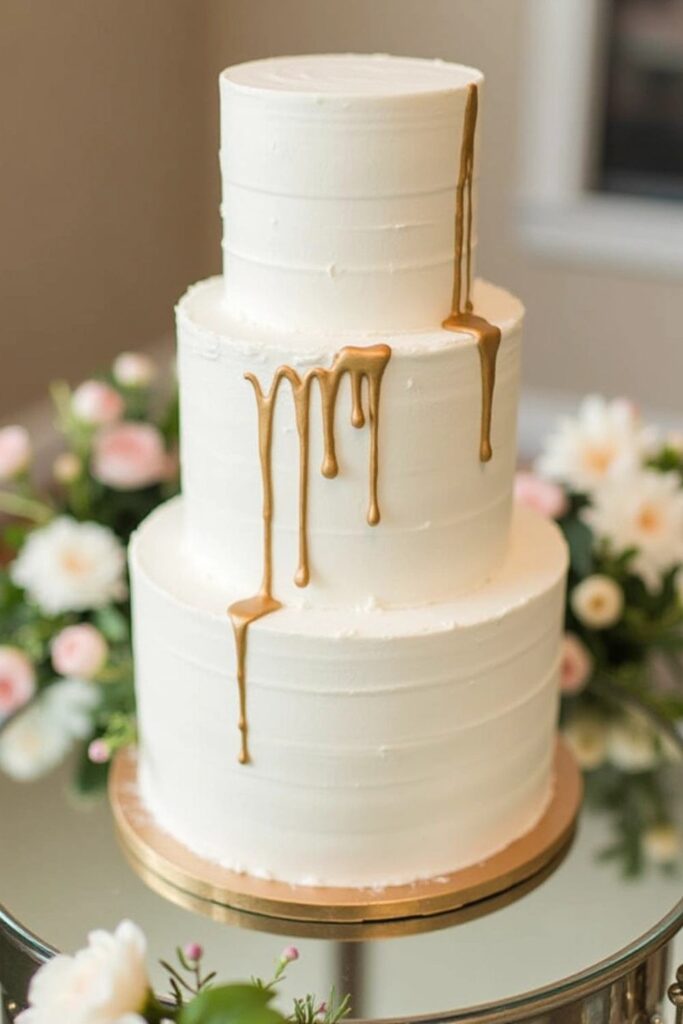Imagine a sleek buttercream cake with a glossy metallic drip elegantly cascading over each tier.