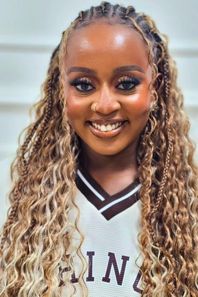 To achieve this style, cornrow the top half and use a curling wand for waves. The mix of textures between braids and waves creates a unique, eye-catching look.