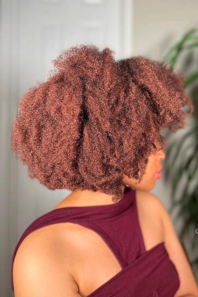 A textured afro with auburn tones embraces your natural texture with color. This style is bold and voluminous, highlighting your curl pattern with a warm auburn hue.