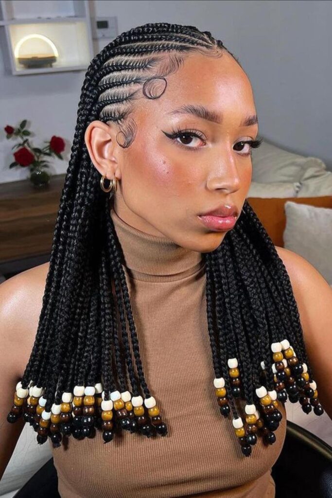 Beaded Fulani braids offer a classic, intricate look that’s perfect for winter. These braids are styled in thin, cornrow patterns, and the ends are adorned with beads for an elegant touch.