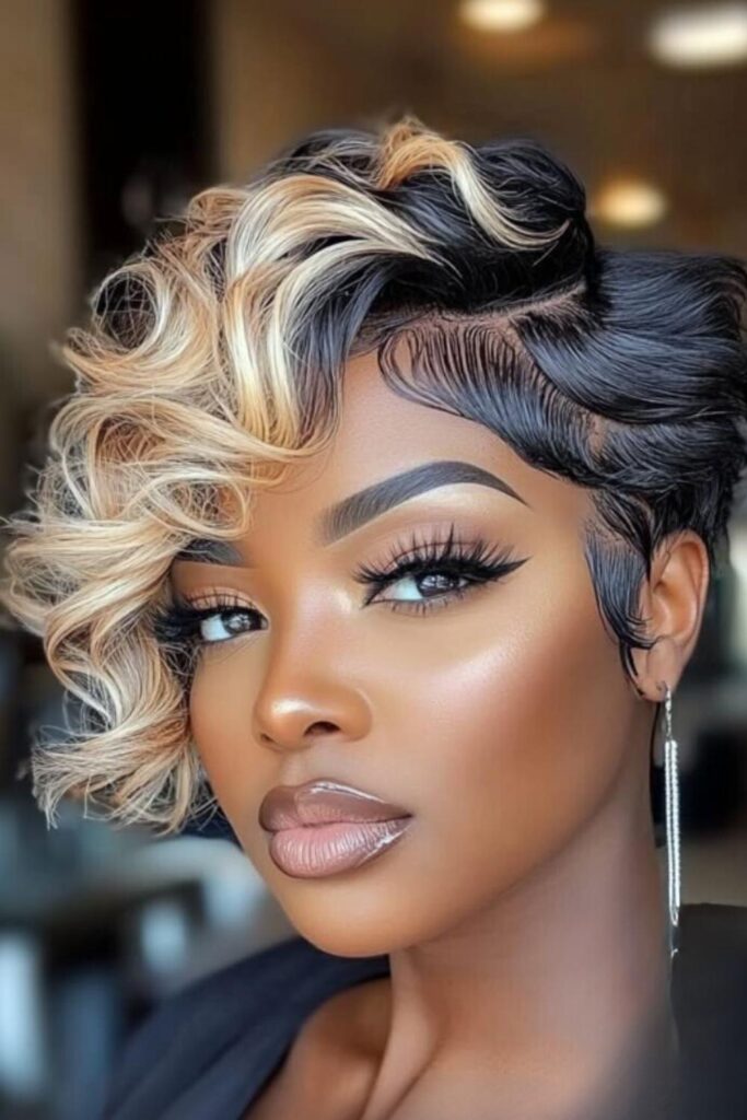 This short pixie cut with blonde highlights offers a chic, modern take on winter hairstyles. The pixie cut features soft waves or curls, with highlights adding dimension and brightness.