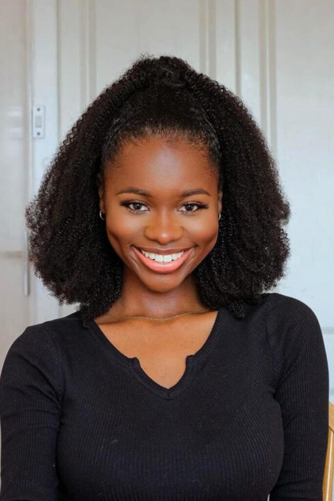 A high puff with natural curls is a simple yet elegant hairstyle that showcases natural texture. Pull the hair up into a puff at the crown, allowing the curls to fan out and create volume.