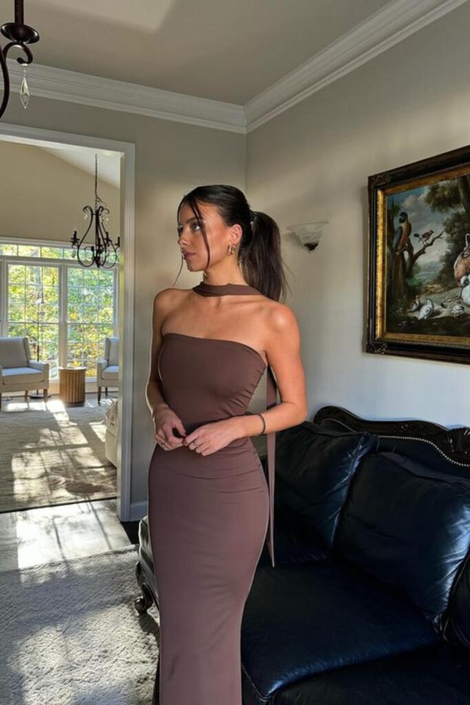 Embrace the sleek sophistication of this chocolate brown strapless dress, perfect for a winter wedding. Its straight neckline and fitted silhouette offer a clean, streamlined look that exudes understated elegance.