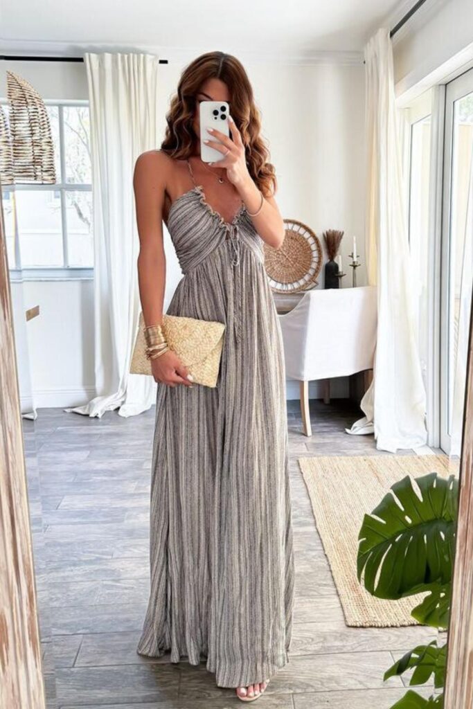 The striped halter maxi dress is the epitome of chic comfort, perfect for a winter wedding with a relaxed or beach theme. Its halter neckline and fitted bodice deliver a structured appearance, while the flowing skirt creates a harmonious silhouette.