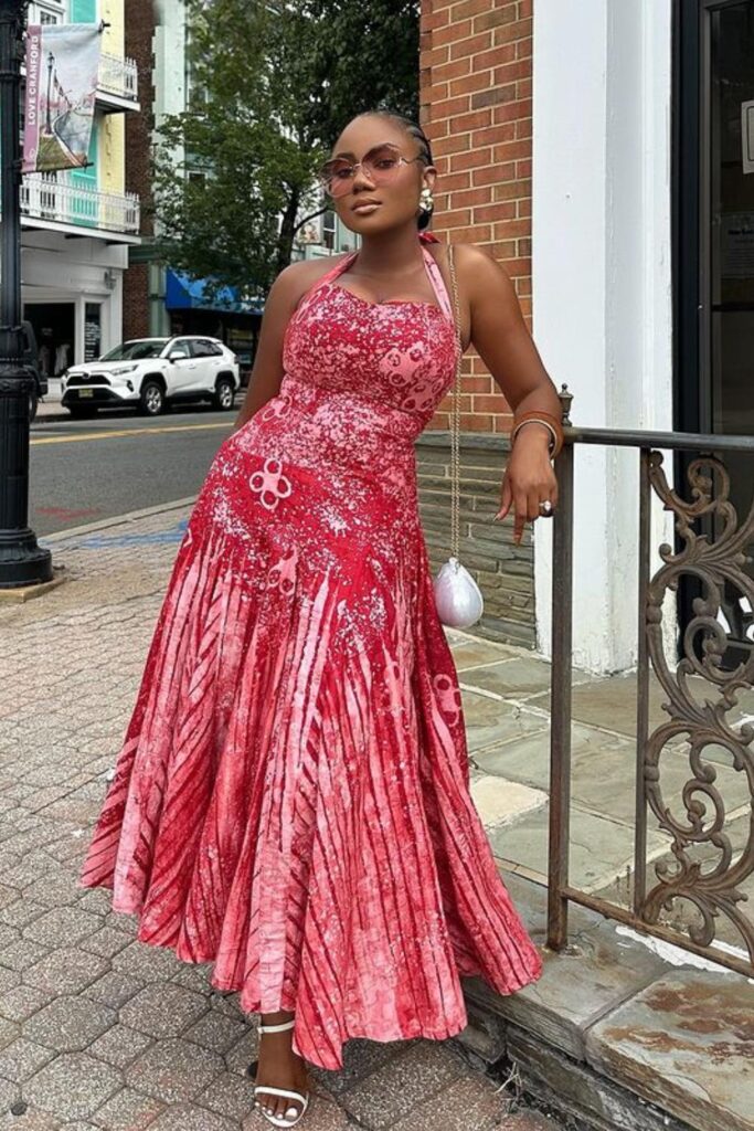 The elegant halter neckline beautifully enhances your shoulders, offering a graceful and poised look. Its pleated fabric adds delightful movement and texture, bringing life to every step.