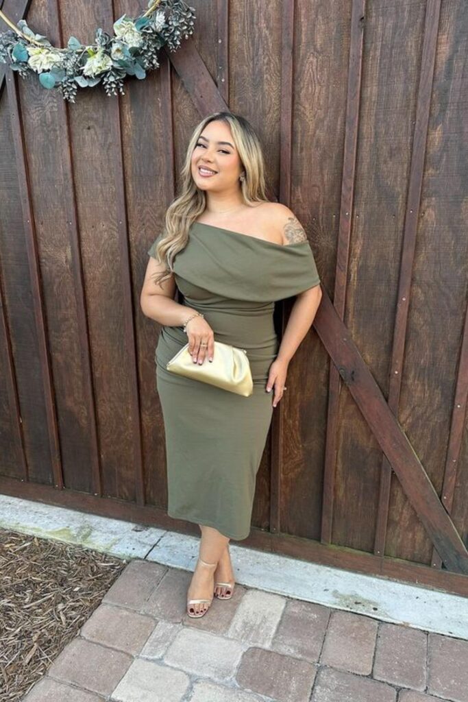 Step into elegance with this olive green off-shoulder midi dress, a perfect pick for a winter wedding. Its off-shoulder design coupled with a fitted silhouette creates a look that is both refined and charming.