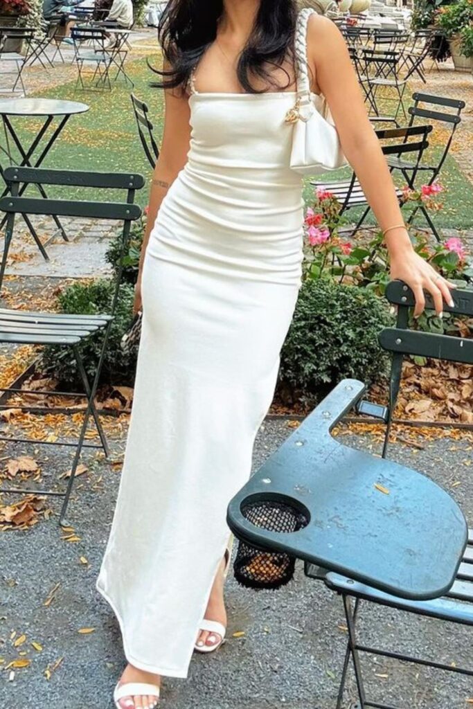 Embrace minimalist sophistication with this ivory slip maxi dress, a stunning choice for winter weddings. Its sleek design and ruched side detailing create a flattering silhouette, while the clean lines promise versatility for any formal gathering.