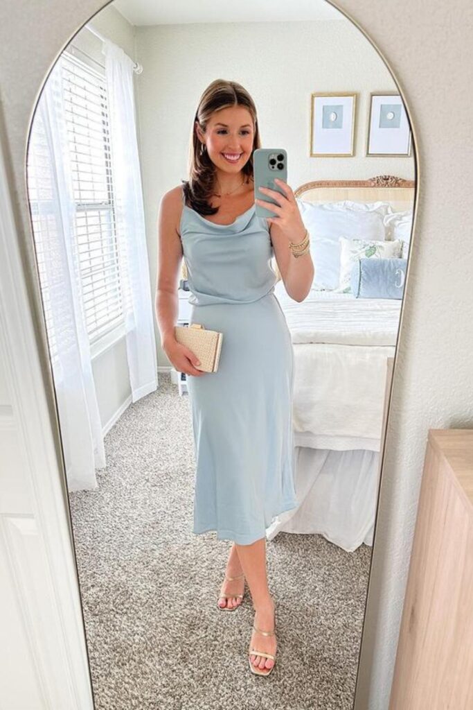 Capture a soft, romantic aura with this light blue cowl neck midi dress, perfect for winter weddings. The cowl neckline and draped fabric offer relaxed elegance, while the light blue hue adds freshness against winter’s darker shades.
