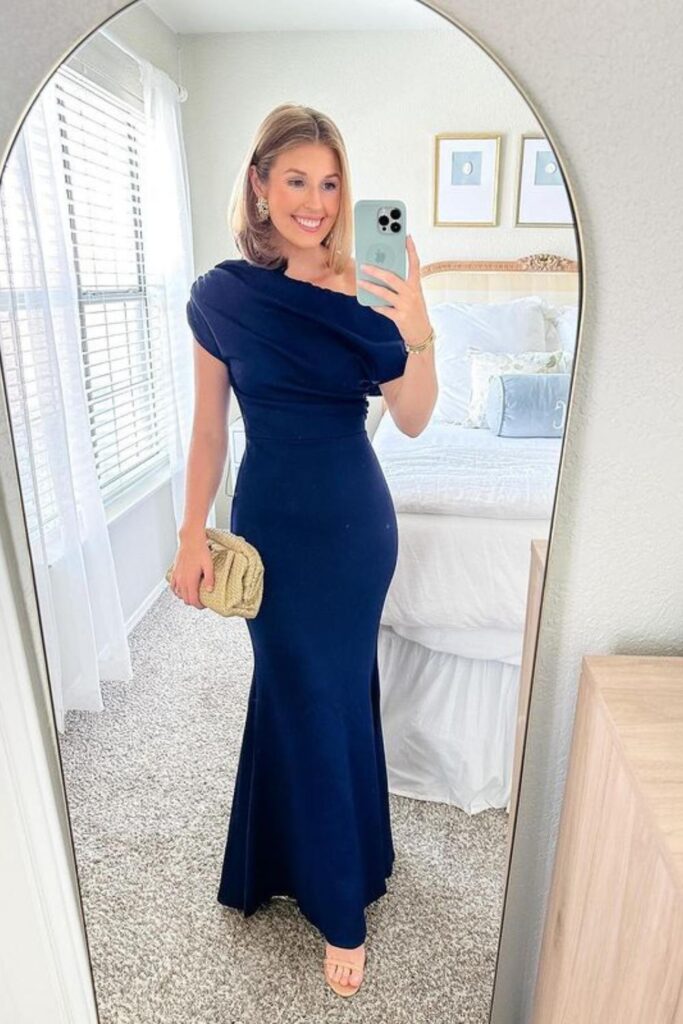 For a touch of classic refinement, choose this navy one-shoulder fitted gown. The asymmetrical neckline introduces a modern twist, while the fitted design crafts a sleek silhouette.